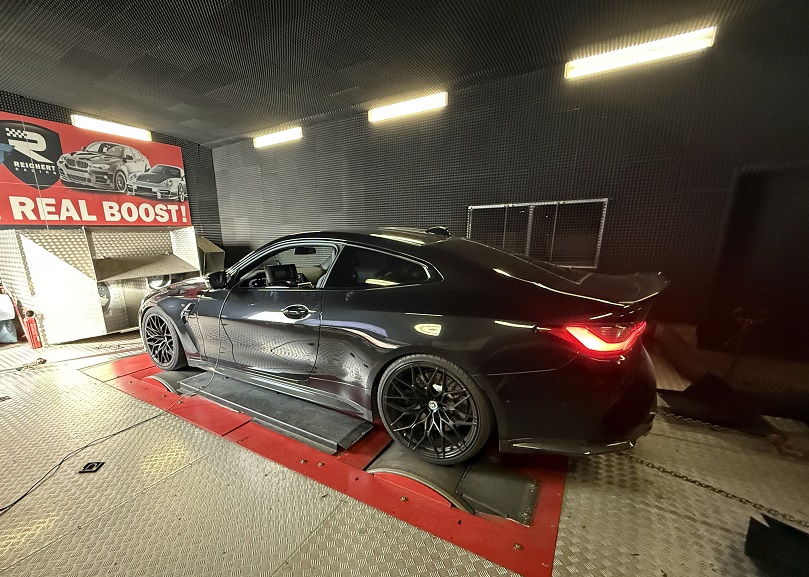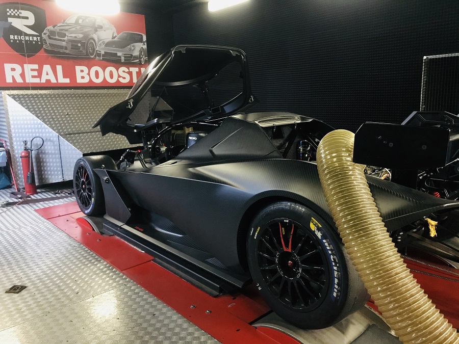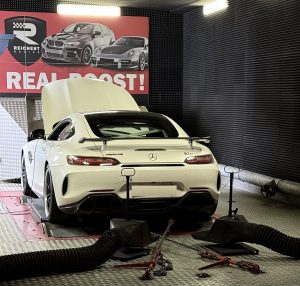 Chiptuning am Leistungsprüfstand bei Reichert :Unter ohrenbetäubendem Lärm wird das Auto im Messgang voll beschleunigt, bis der Drehzahlbegrenzer dem tosendem Treiben bei zirka 7200/min ein Ende setzt. Auf freier Wildbahn entspräche dies einem Tempo von gut 320 km/h. Theoretisch lassen sich auf solchen Prüfstanden Geschwindigkeiten von über 340 km/h simulieren.